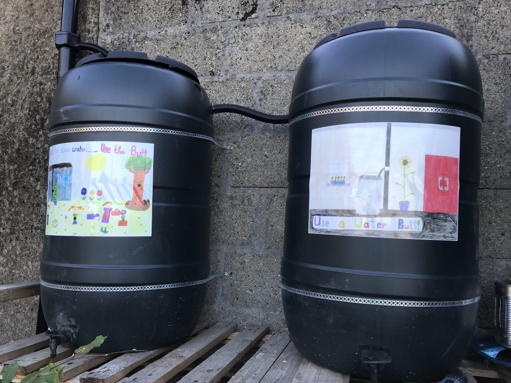 Water butts installed to collect rainwater at Ferns Community Garden Posters designed by local school children