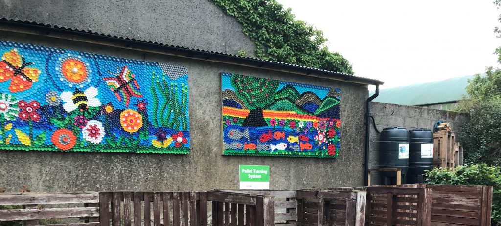 The mural was placed at the Community Vegetable garden and home composting demo site . Ferns Tidy Towns use this area to run workshops on reducing waste, composting, growing your own and water conservation.