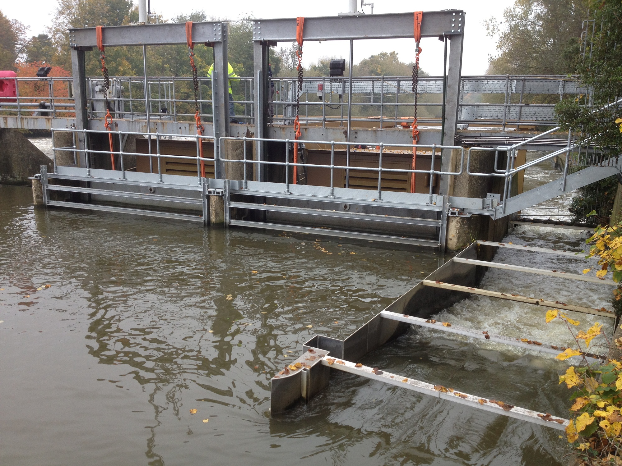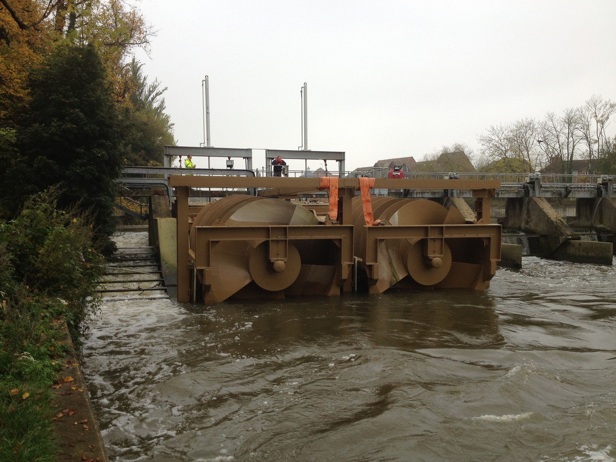 The golden brown colour of the turbines and their housings were chosen by the residents of Eton, who look out onto the weir.