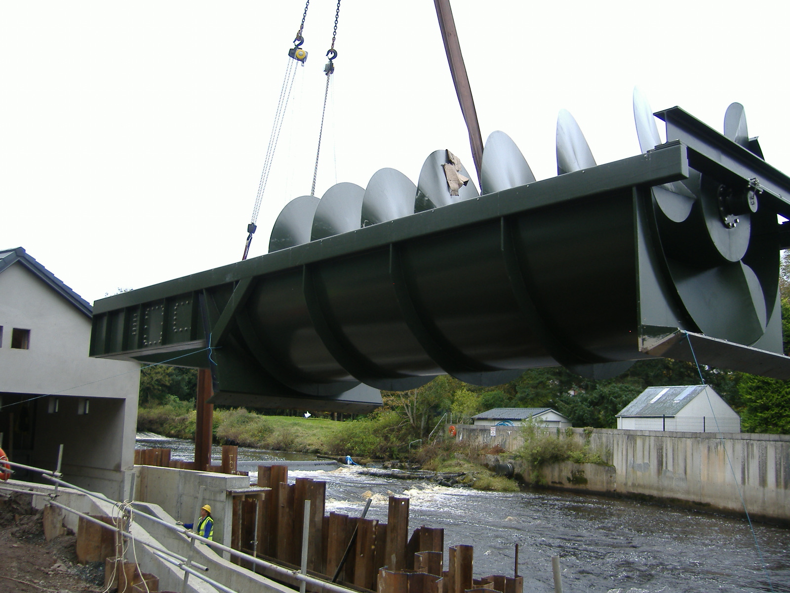 Screw is installed at an angle of 26deg. in this channelMoving into positionIn situA lifetime of clean, green generation aheadFish pass installed along side the ScrewCompleted project