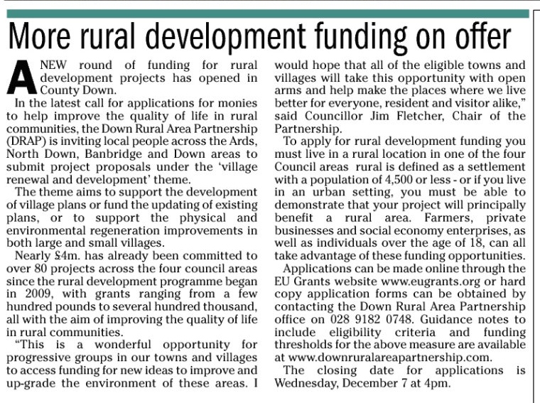 Applications can be made online through the EU Grants website www.eugrants.org or hard copy application forms can be obtained by contacting the Down Rural Area Partnership office on 028 9182 0748. Guidance notes to include eligibility criteria and funding thresholds for the above measure are available at www.downruralareapartnership.com. The closing date for applications is Wednesday 7th December 2011 at 4.00pm.
