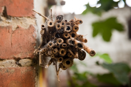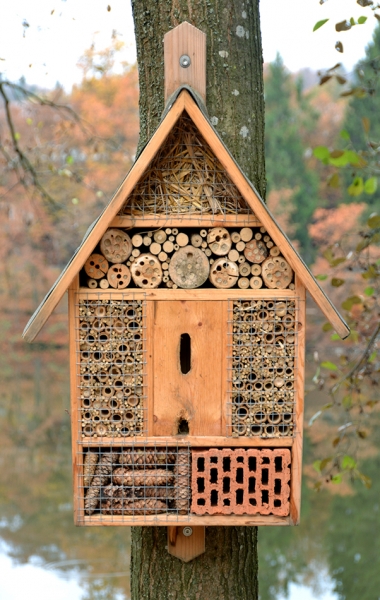 Another easy design is to take a bundle of bamboo canes or other twigs and tie them together with a piece of string. Hang up the bundle under the branch of a tree or to a railing and the insects will start to move in.