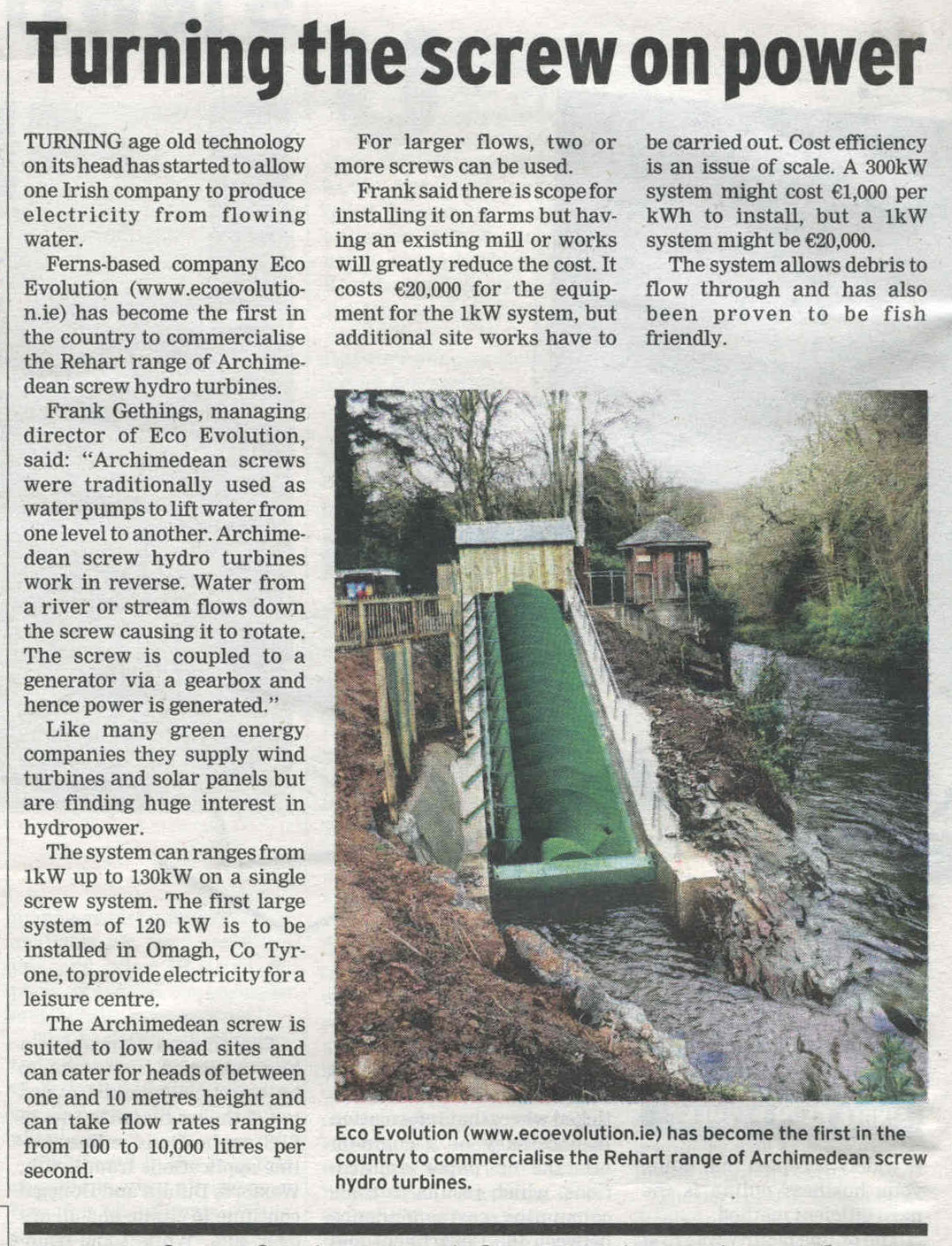 Ferns based company Eco Evolution (www.EcoEvolution.ie) has become the first in the country to commercialise the Rehart range of Archimedean screw hydro turbines.