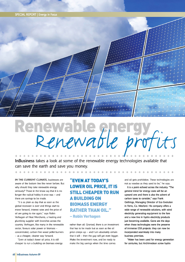 “… It is a point echoed across the industry. ”The general trend for energy costs will be an upward one and there is also the advent of carbon taxes to consider,” says Frank Gethings, Managing Director of Eco Evolution in Ferns, Co. Wexford. His company offers a wide range of renewable solutions, with wind electricity generating equipment to the fore and a new line in hydro electricity products just becoming available. Gone are the days when these technologies were the preserve of immense ESB projects: They can now be incorporated seamlessly into many business premises.