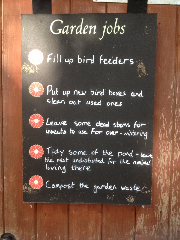 IMG_5951 (800x600)On the day of our visit the sun was shining through the autumnal leaves making this peaceful haven in the middle of London a delight to be in. Many of the plants were turning to seed and coming to the end of their flowering season. With the colder weather just around the corner the community volunteers were busy preparing for the Winter months ahead by ensuring to provide suitable hibernation habitat for the many species of mammals, invertebrates and beneficial insects to help enrich the local ecosystem, cleaning out and erecting new bird boxes, tidying parts of the pond and composting the garden waste.